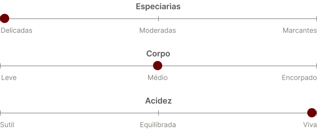 Intenso e frutado, com notas vibrantes de frutas vermelhas maduras, como cerejas e amoras, além de sutis toques de especiarias.